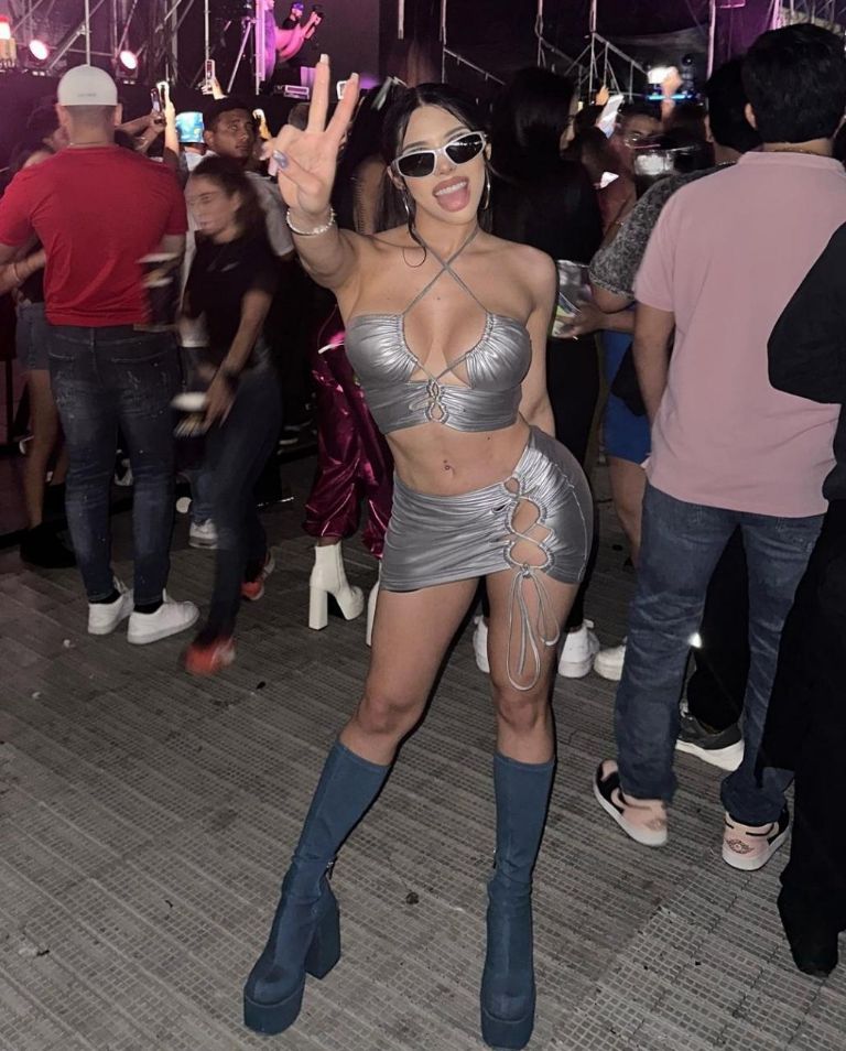 En esta ocasión, Yeri acudió al concierto de Rauw Alejandro y como la 'fashionista' que es se destacó con un conjunto plateado con el que por poco muestra demás, pues se trata de una ajustada minifalda que se amarra por delante y deja apreciar sus encantos, mientras que en la parte de arriba un diminuto top con pronunciado escote. Respecto a su calzado unas fabulosas botas de plataforma y tacón cuadrado, así como unas gafas oscuras de accesorio.