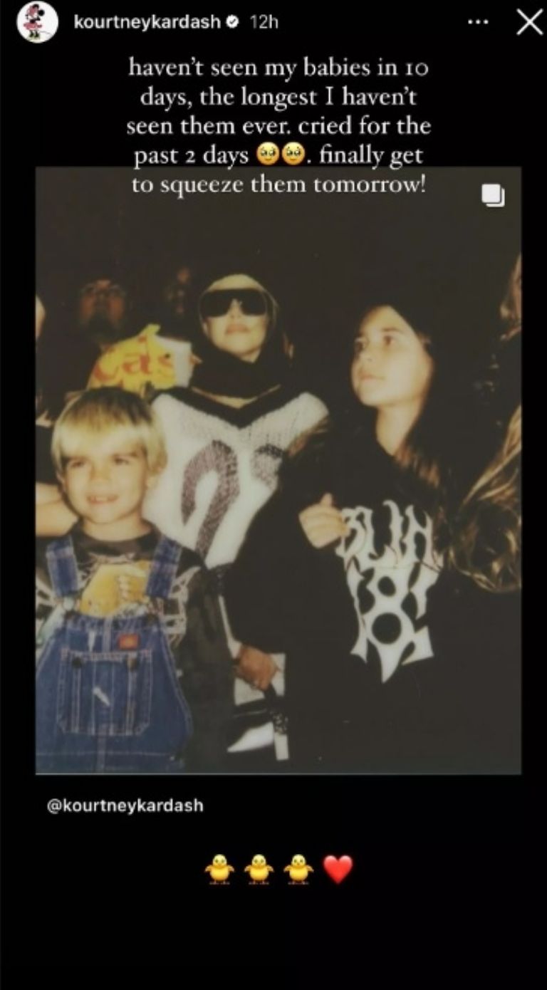 No he visto a mis bebés en 10 días", escribió Kardashian, de 44 años, en una historia de Instagram de sí misma usando gafas de sol y un pañuelo negro en la cabeza en un show anterior con sus dos hijos menores, "el más largo que no los he visto, lloré durante los últimos dos días, ¡finalmente puedo apretarlos mañana!